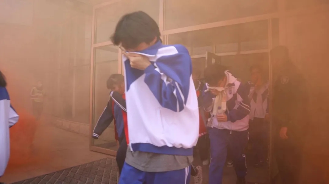 在实施消防演练前,老师和同学们为此次活动制定了详细的消防疏散演练方案,对各楼层逃离的路线及每位志愿者的职责、每层楼梯口的值班人员安排等工作都作了明确的规定。在充分准备和妥善安排之下,学生们在老师的引导下,用提前准备好的湿毛巾捂住口鼻,配合警报指令,井然有序的从教学楼内快步跑出教学楼。