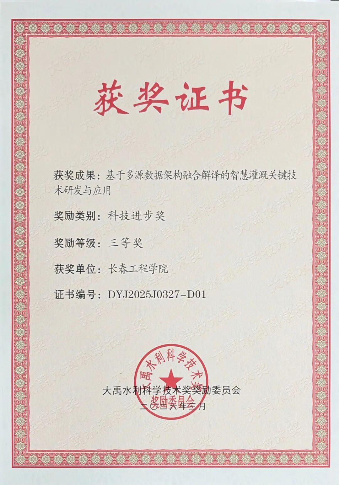 近日,水利部正式公布2025年度大禹水利科学技术奖获奖名单,本届共评选出技术发明奖、科技进步奖、自然科学奖、创新团队奖四类奖项,总计80项成果上榜。我校水利工程学院刘鸿涛老师团队完成的“基于多源数据架构融合解译的智慧灌溉关键技术研发与应用”成果荣获科技进步奖三等奖,这是我校首次获此殊荣,标志着我校在现代农业智慧灌溉领域的研究水平迈入全国先进行列。